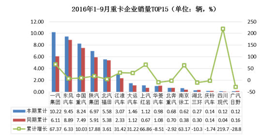 2016年1-9月中重卡企业中,东风汽车销量排名第一,累计销量达到13.74万辆,同比增长8.47%;销量前十五企业中,重庆力帆、上汽红岩和南京徐工销量增长较大,增幅均超过60%。